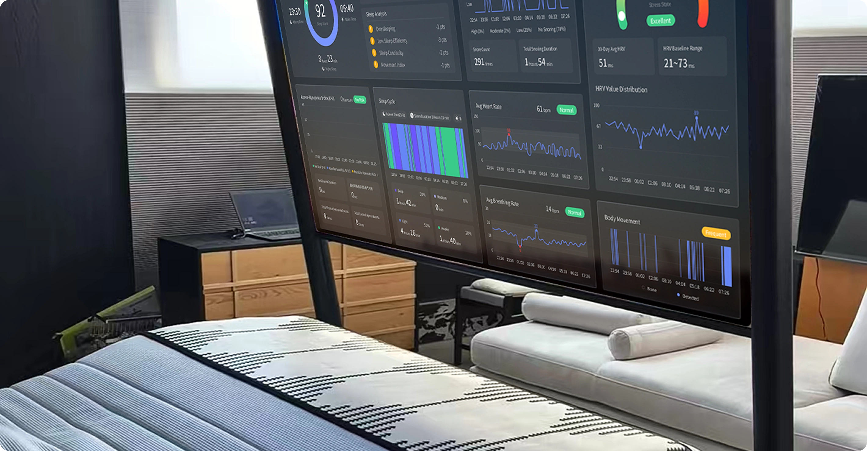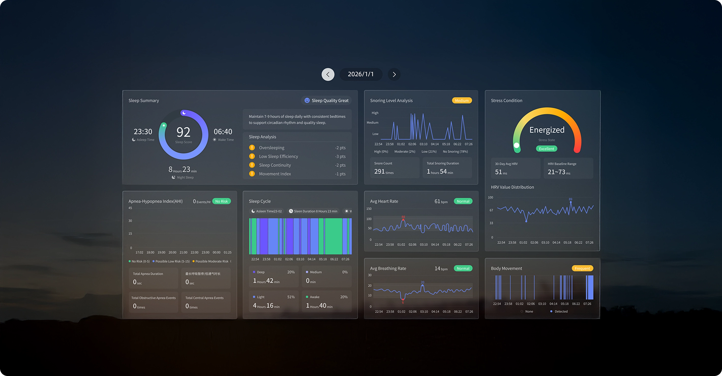 Instant summary of heart rate, breathing, sleep stages, and quality—delivered clearly, with human insightslike “Strong deep sleep recovery tonight.”
