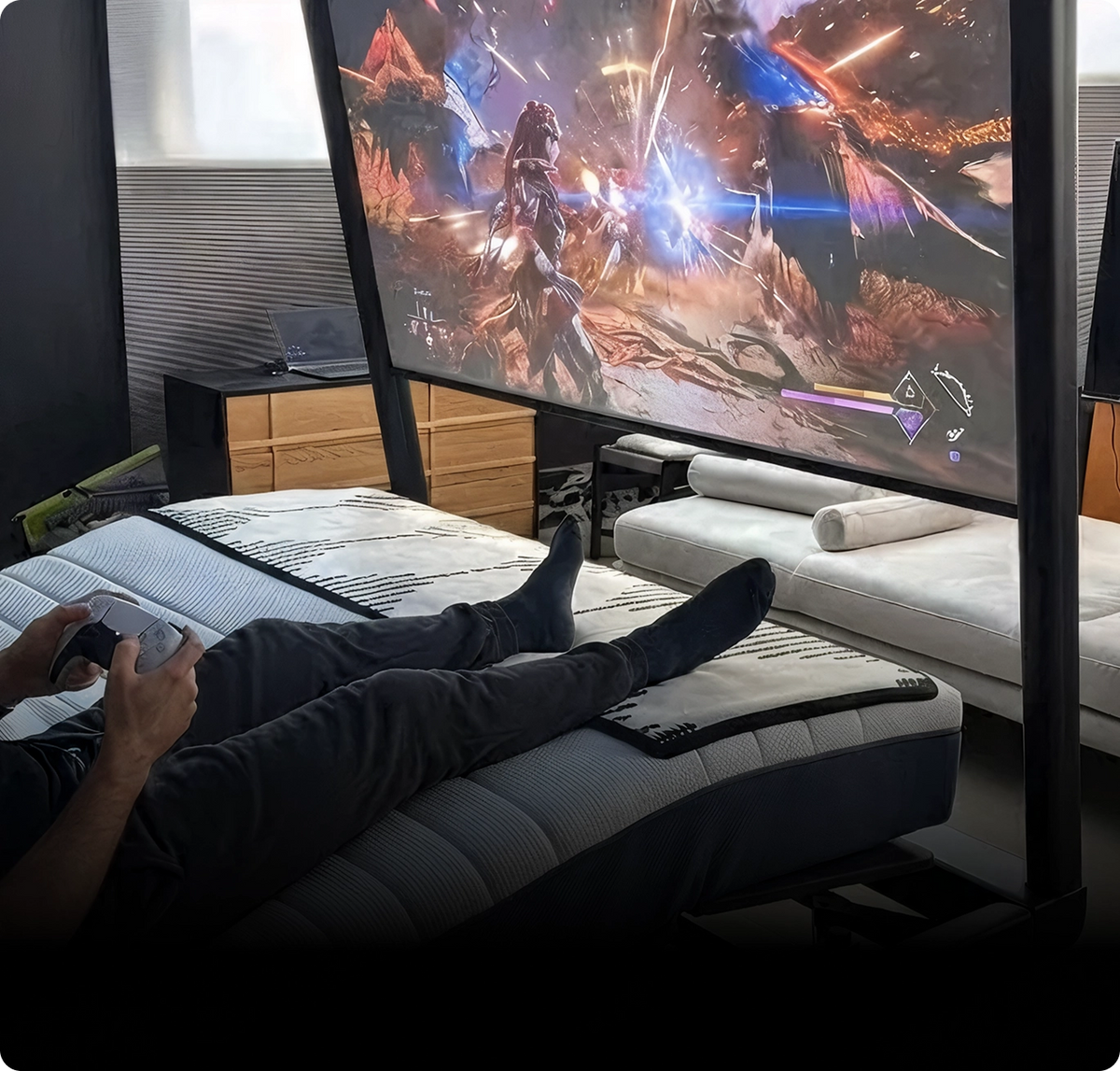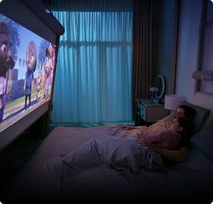 Surround sound, large-screen projection, and synchronized ambient lighting create a cinema-level experience. The bed becomes part of the storytelling.